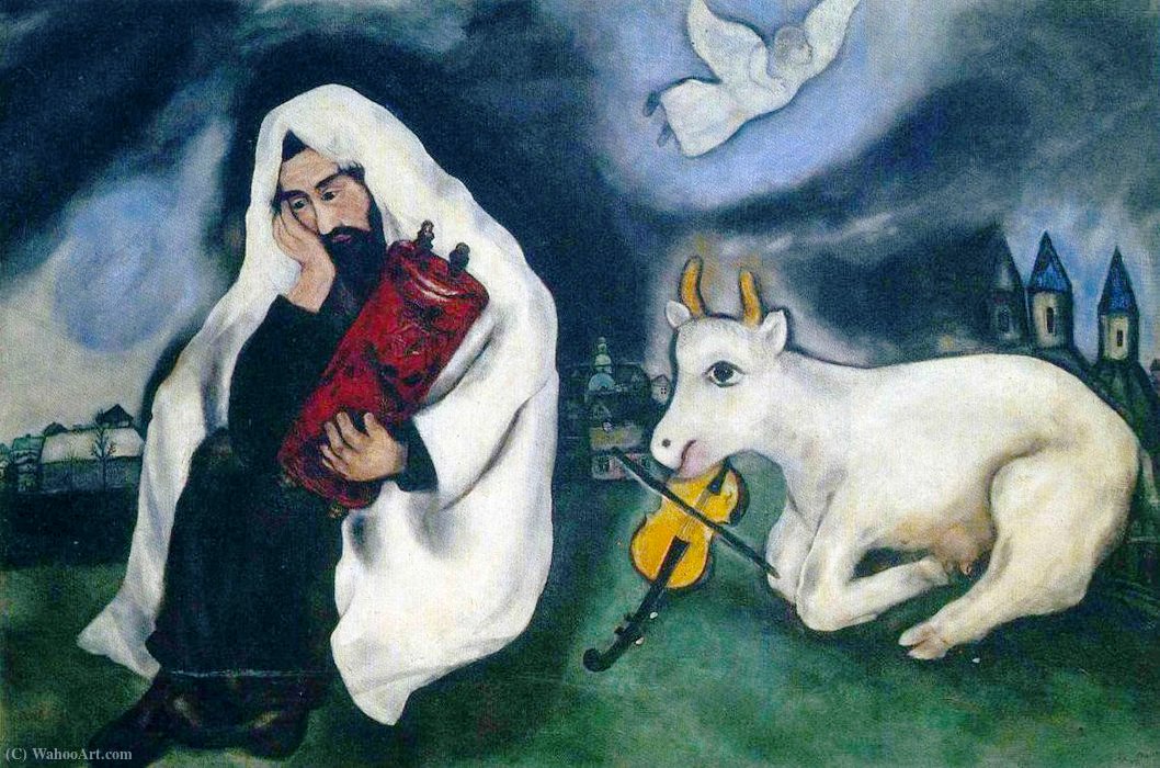 Born in 1887 in Vitebsk, the firstborn of nine children, Chagall’s life, like his work, gives the impression of a pilgrim in a constant movement between worlds and between cities, rising from humble origin into a wealthy milieu, traveling the world and yet longing for the warm place of simplicity and familiarity that is so strikingly evident mainly in his touching depiction of village life where family, religion, nature and music are closely interconnected. A child of a devoted Jewish family, his decision to embark on an artist’s path was definitely not without obstacles, but a steady flow of artistic output that followed his starting point at the studio of Yehuda Penn in 1906 shows a man wholeheartedly devoted to a vocation that he with the same characteristic charm reflected also in his paintings made entirely his own.
